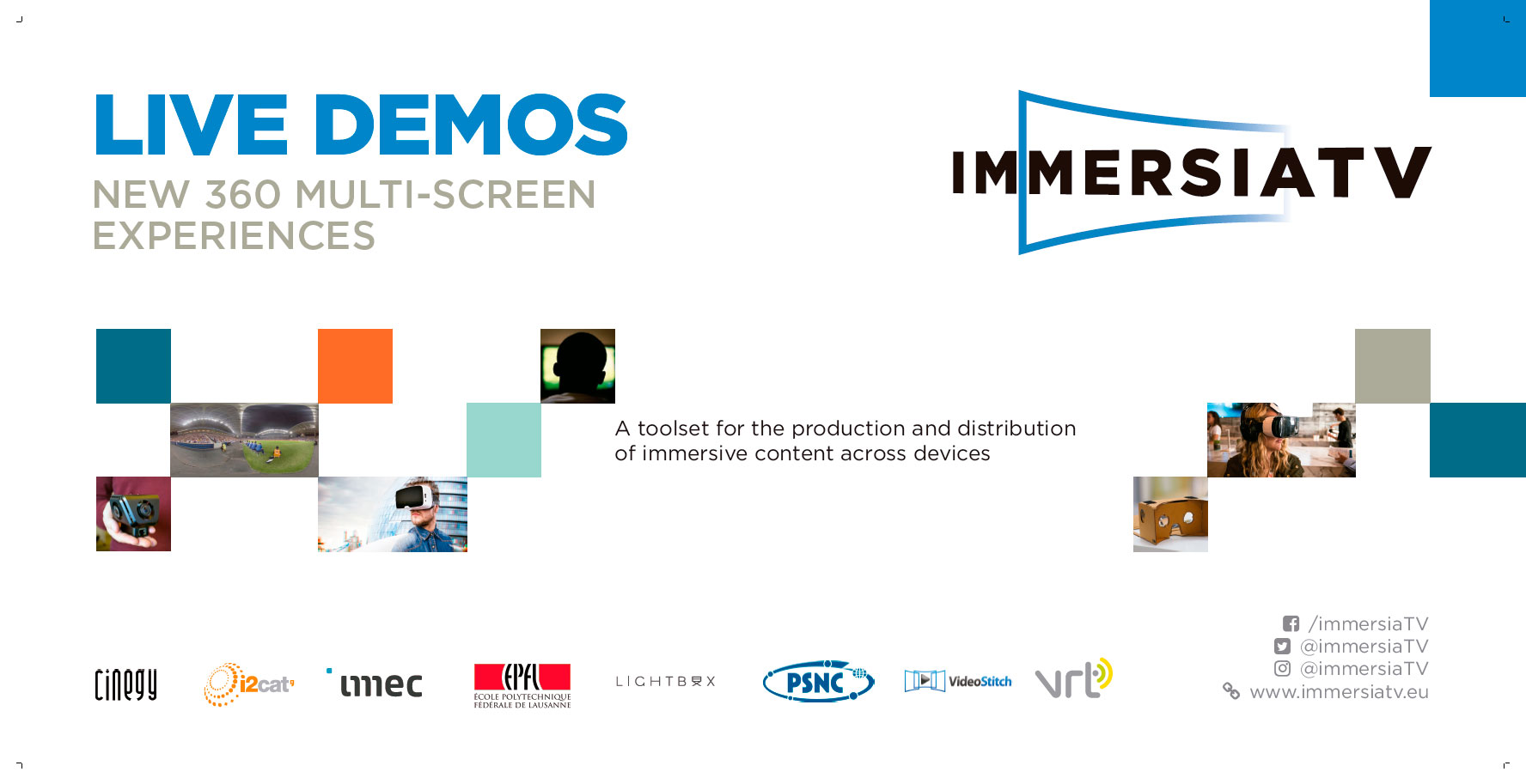 ImmersiaTV is present in several events. All the communication and dissemination material used, will be made available (for download) in this section. Just click the images and learn more about our project. Of course, you can always get more information sending an email to us (info[at]immersiatv.i2cat.net).